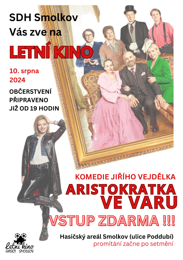 SDH Smolkov Vás zve na letní kino "Aristokratka ve varu" - sobota 10. srpna 2024, hasičský areál ve Smolkově.