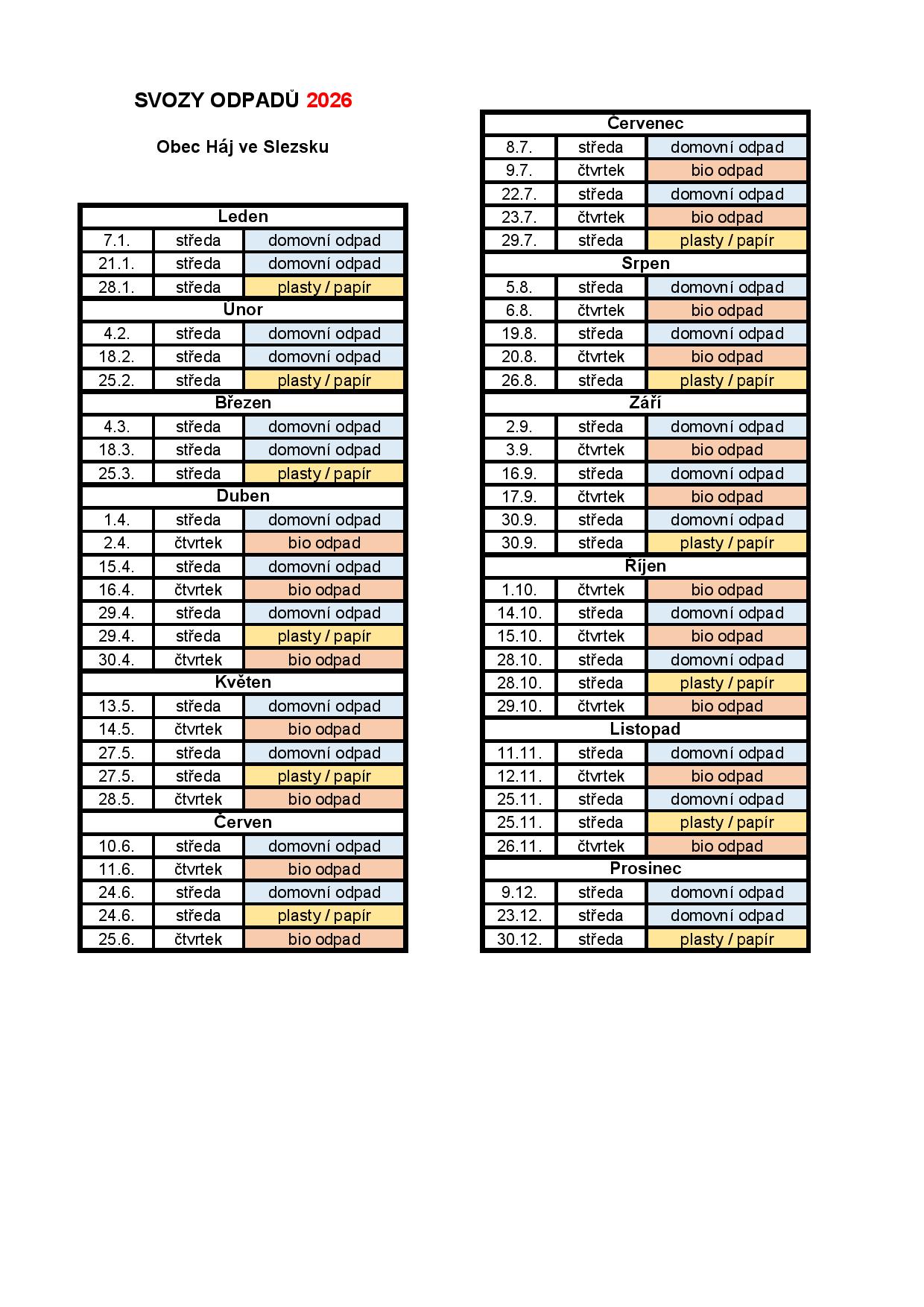 V roce 2026 budou svozy bio odpadu probíhat ve stejném režimu jako doposud tj. v období duben až listopad, každý sudý kalendářní týden, a to ve čtvrtek, bez ohledu na to, jde-li o pracovní den nebo svátek. První svoz se uskuteční 2. dubna 2026 za předpokladu, že nebude mrznou. Harmonogram svozů bio odpadu v roce 2026 naleznete zde.